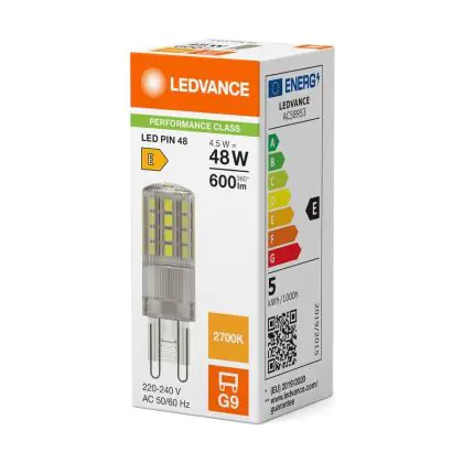 Puoi risparmiare fino al 80% di energia e mantenere i costi di manutenzione veramente al minimo, grazie al minimo consumo di soli 4.5W e una durata della vita media utile di 15000 ore. Le tradizionali lampade alogene G9 hanno una durata di sole 2000 ore. Le lampade LED inoltre non emettono raggi IR e UV che sono dannosi e non produce calore! Installare questa lampada è veramente facile: spingi la vecchia lampada G9 fuori dall’attacco quando si è raffreddata, metti la nuova lampada G9 nell’attacco. Questo prodotto ha un alta qualità Ledvance e disponibile a partire da . Puoi usare questo prodotto senza aver nessun pensiero grazie al nostro Lampadadiretta.it garanzia totale di 3 anni.