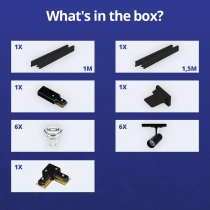 Descrizione Set completo 1-Fase Rail L 1x 1,5 Metro Nero | incl. 6x Faretti + GU10 2700K 3W Dimmerabile + Tappo Di Chiusura, Connettore di Alimentazione e L -Connettore